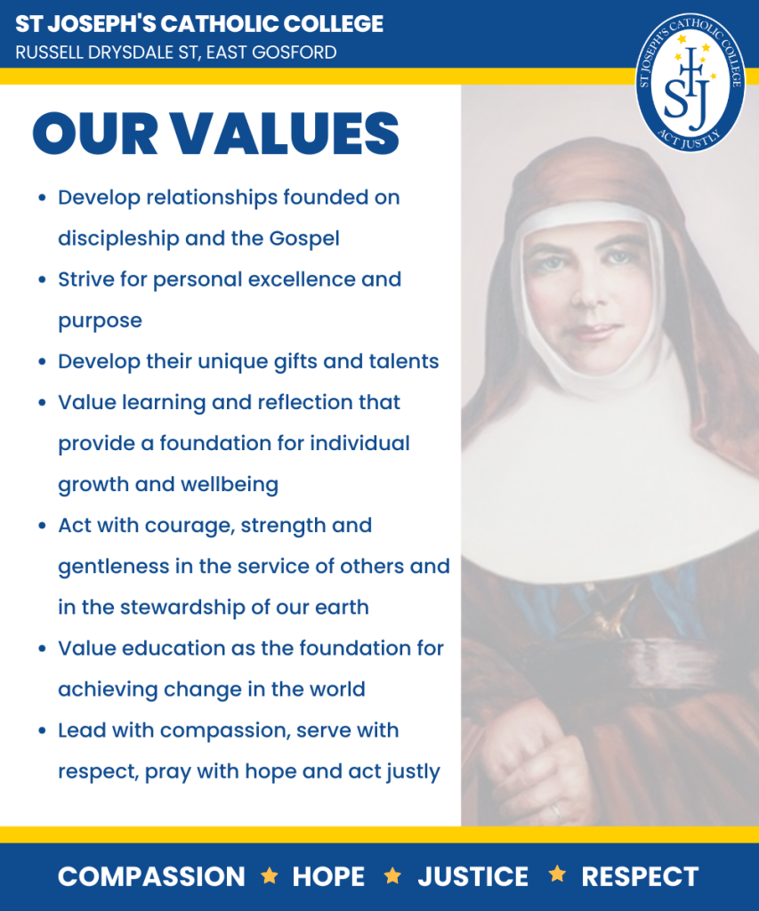 The St Joseph’s Catholic College community empowers young women who are shaped by their relationship with Jesus Christ within the Catholic tradition and inspired by St Mary of the Cross MacKillop to make a difference in the world.